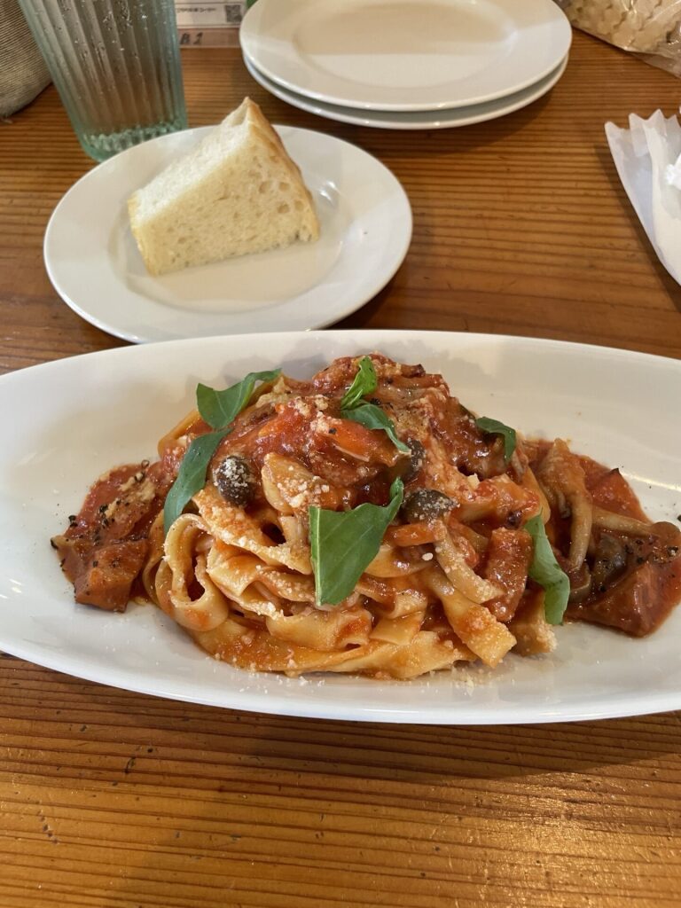 アマトリチャーナは平打ちのパスタでピリ辛ではなく、甘めのソースでバジルがいいアクセントでした。