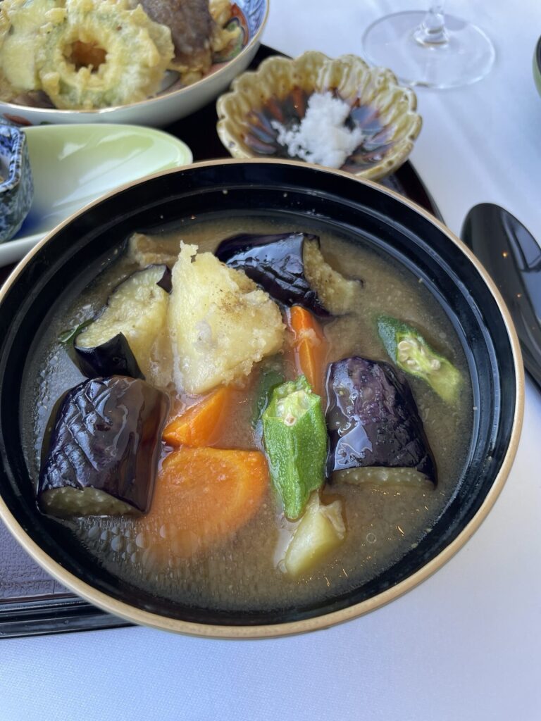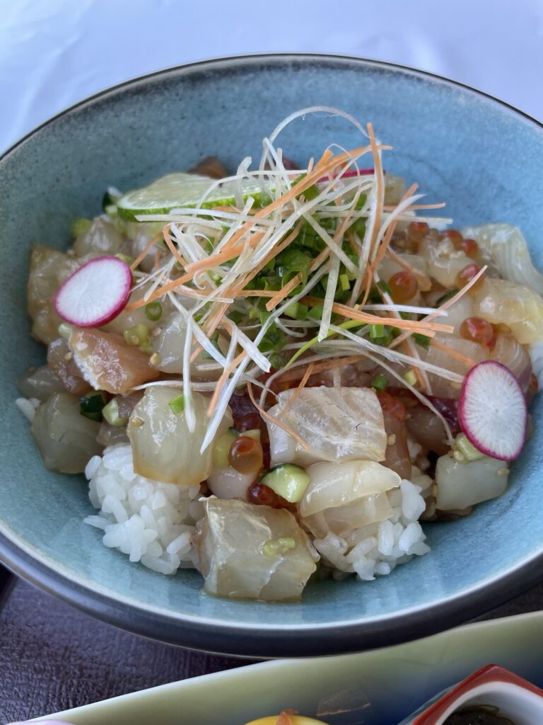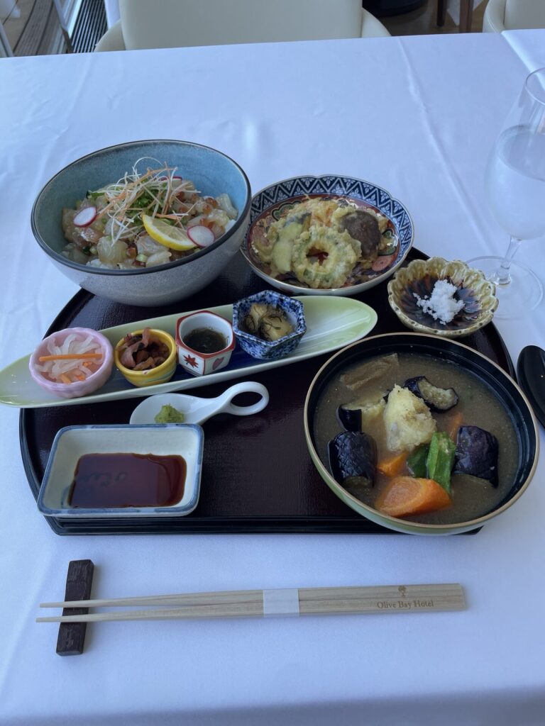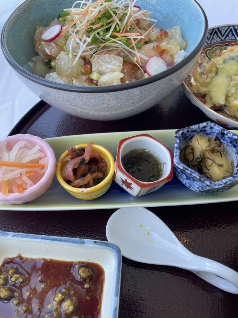ヒラス、貝柱、イクラが沢山入った丼に天麩羅、小鉢、夏野菜がたっぷり入った料理長特製の合わせ味噌を使った味噌汁など、これで何と1,500円です!
