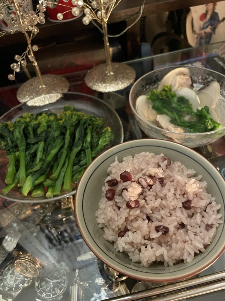 K様にいただいた雛人形を飾りお赤飯、菜の花のお浸し、蛤と菜の花のお吸い物を作ってお祝いです!